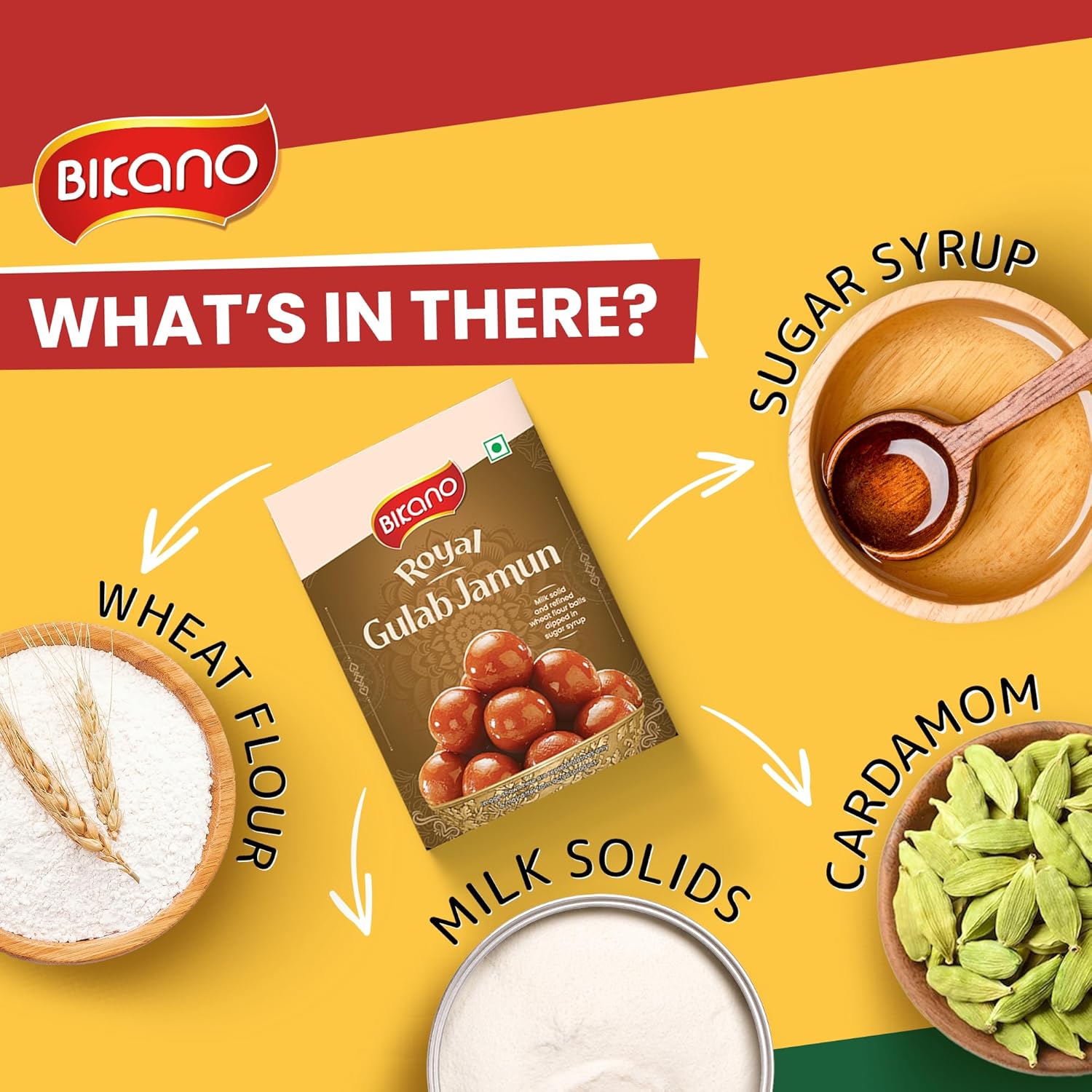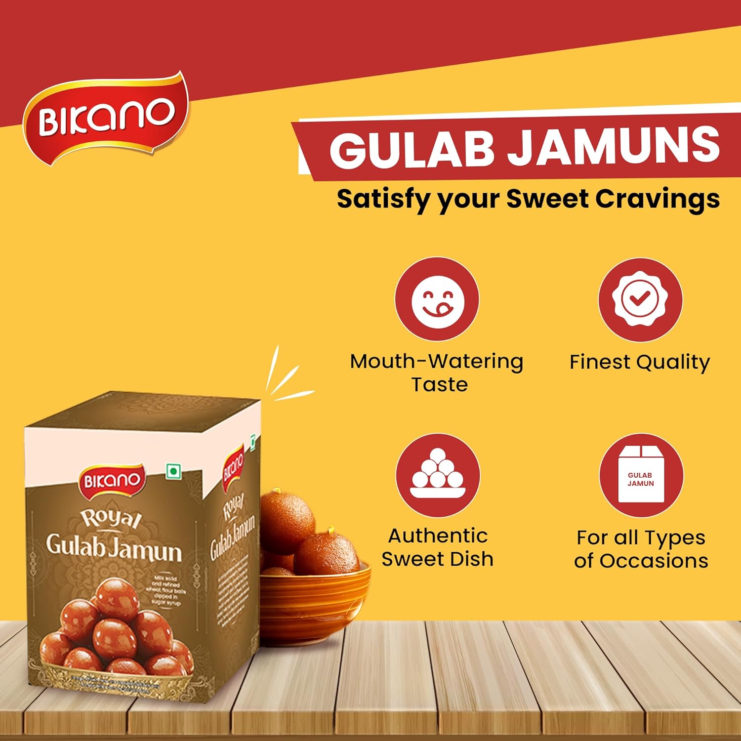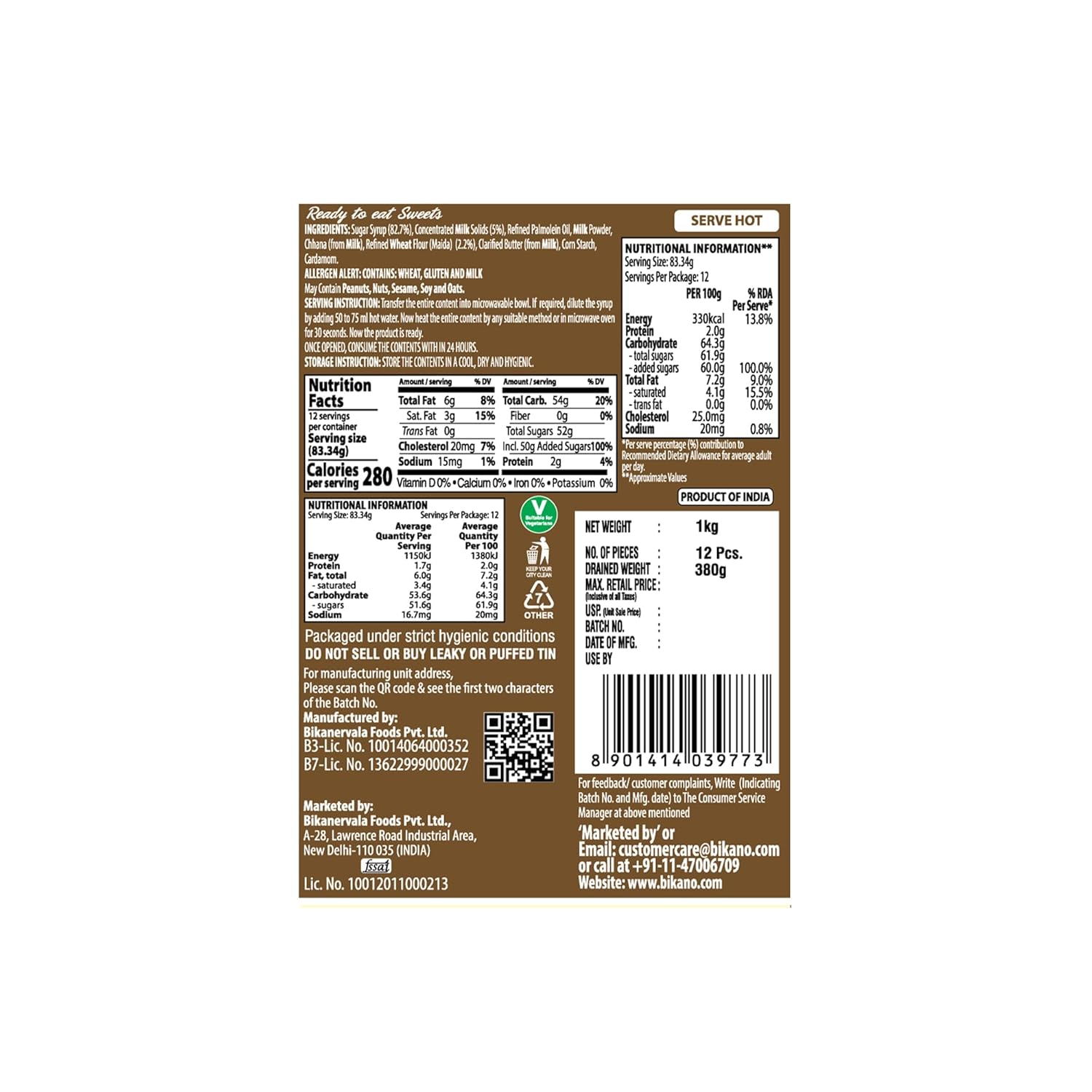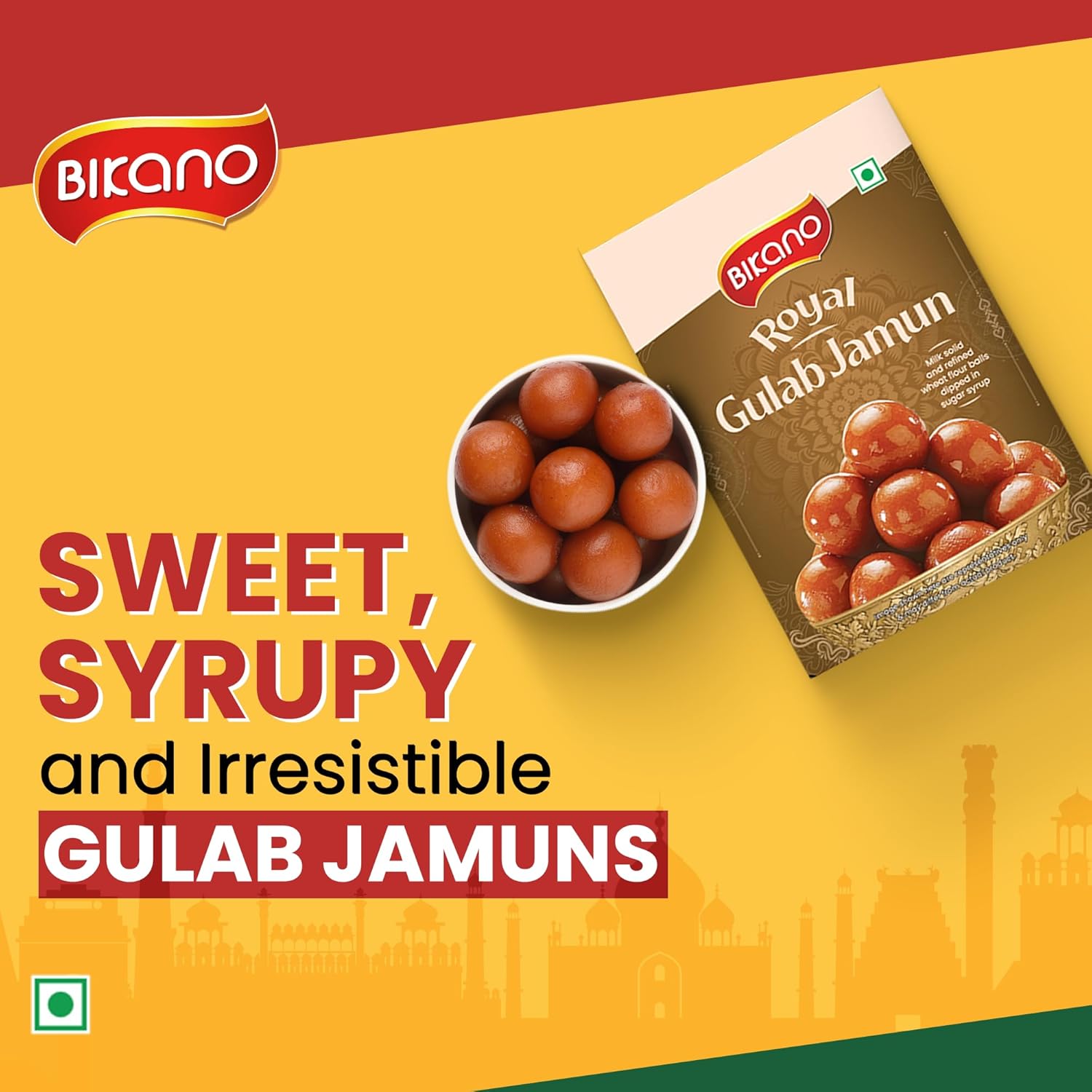 Bikano Gulab Jamun is a beloved Indian dessert that is cherished for its rich, indulgent taste and melt-in-your-mouth texture. It's a classic sweet that holds a special place in Indian cuisine and is often served during celebrations, festivals, and joyous occasions. STORAGE INSTRUCTION: STORE THE CONTENT IN COOL, DRY AND HYGIENIC CONDITION. PROTECT THE CONTENTS FROM AIR AND DIRECT SUNLIGHT. ONCE OPENED, CONSUME THE CONTENTS WITH IN 24 HOURS. SERVING INSTRUCTION: Transfer the entire content into microwavable bowl. If required, dilute the syrup by adding 50 to 75 ml hot water. Now heat the entire content by any suitable method or in microwave oven for 30 seconds. Now the product is ready.