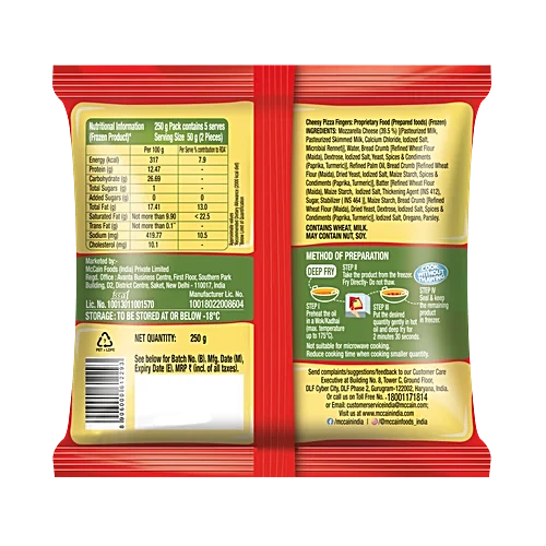 Crunchy, Cheesy Pizza, in a finger form-Mozzarella Cheese with Italian-style herbs Restaurant-like Cheese Pizza Ready in 3 minutes Satisfaction of serving a snack loved by all family members Cheese Pizza in Finger Form – a new cheesy snack in pizza flavour loved by all, restaurant-like taste in 3 mins the ‘preferred choice of prepared savoury snack for the family’ Rich and different eat experience associated with mouthful-ness/burst of cheese More filling/satiating in light moments of hunger à Creating stomach enriching experience “The cheese easily oozes out of the outer covering while frying”.