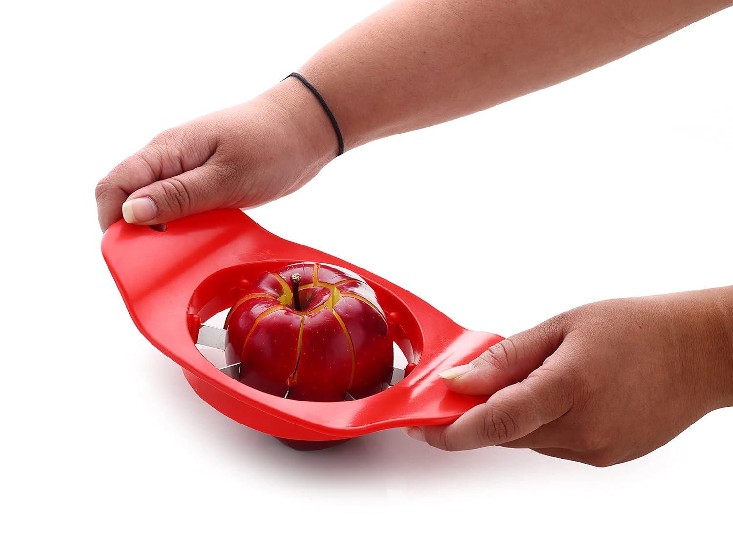 Cut Apples with Ease: The seeded core in the centre of an apple makes cutting it a particularly difficult and cumbersome experience. The Ganesh apple cutter, with its unique design and high quality materials, aids in cutting uniform slices of apples in a simple and efficient manner. Simply press it down against an apple and the sharp stainless steel blade slices through it into eight even slices. Multipurpose Use, Easy to Maintain: Using the Ganesh apple cutter, you can quickly serve your guests or family members with neatly cut apple slices or use them in a fruit salad as per your requirements. The unique design of this cutter precisely removes the core, thus eliminating seeds and giving you only the desirable flesh of the fruit. Made from high quality plastic and stainless steel, this apple cutter is durable and will last for a long time even with regular use. For cleaning, simply wash the cutter with detergent and water.