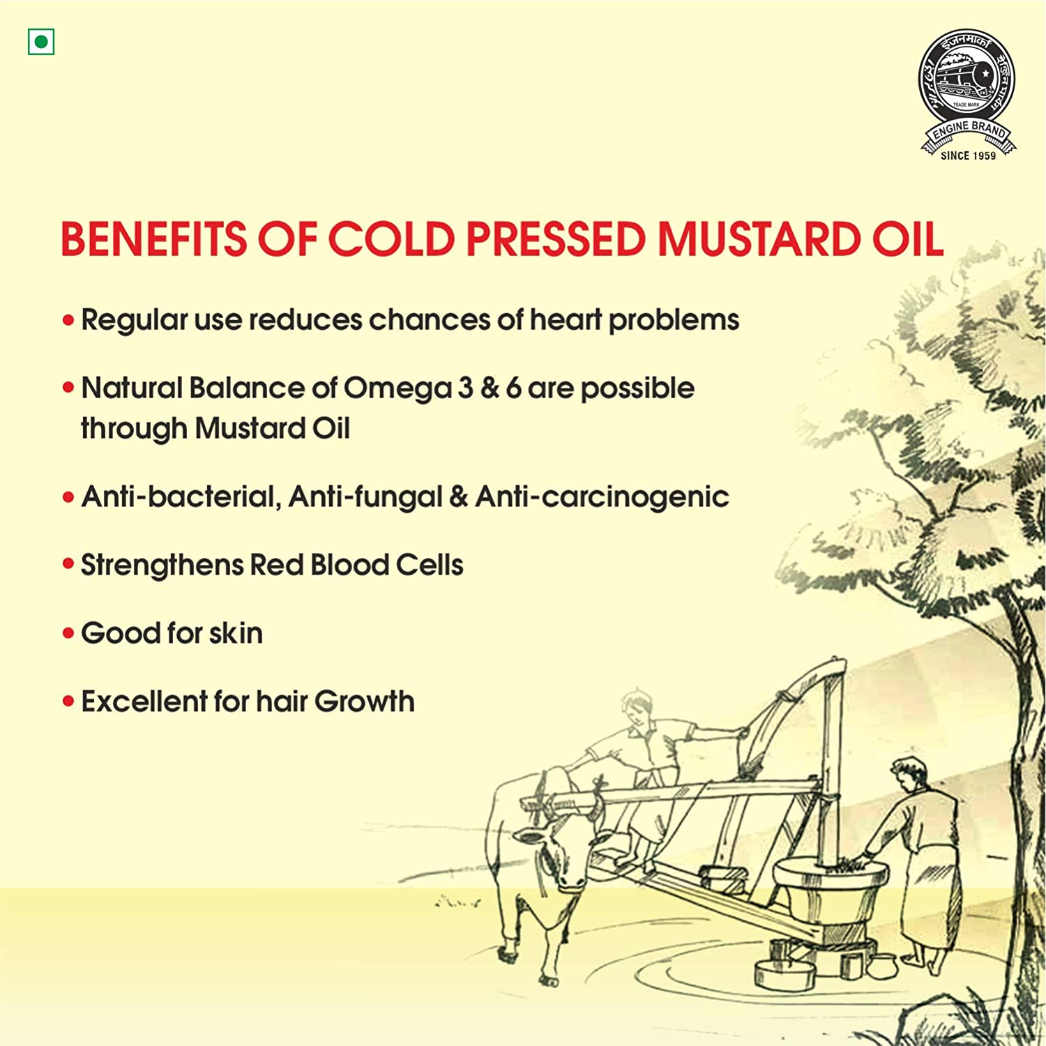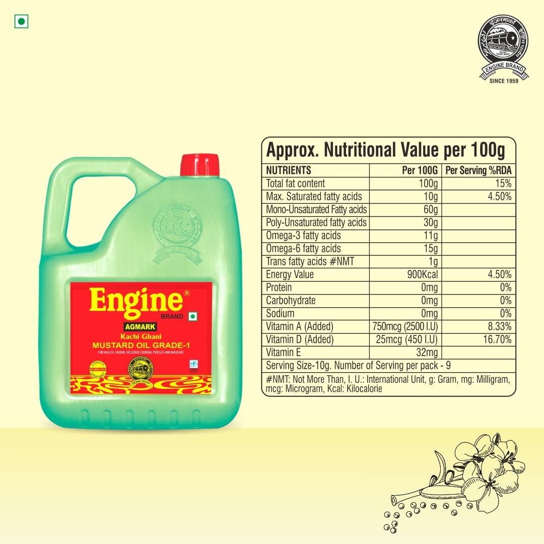 Engine Brand Agmark Grade -1 Kacchi Ghani Mustard Oil is manufactured from hand-picked mustard seeds, using a traditional process but in a modern set-up. This helps to retain the high pungency and the natural properties, enhancing the taste of the food, it is the perfect choice for cooking Indian delicacies. Engine Brand Mustard Oil has been ruling the hearts of Indian consumers for the last 57 years. Engine has always been a preferred choice of the consumers for cooking. The brand has introduced a wide range of food products which ensure good taste, health and delight. Made from the best ingredients in the most modernized set-up, they are purified and packed in food-grade packaging, before being rolled out.