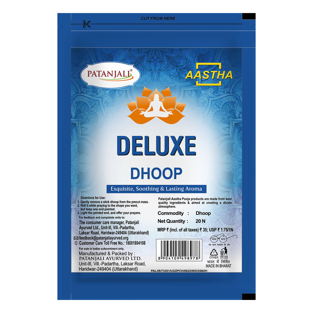Your true faith takes you close to god. Patanjali aastha pooja products are made from the best quality ingredients and aimed at creating a divine atmosphere. Aastha premium deluxe Dhoop is considered the natural fragrance and the ayurvedic herbs has a great significance in controlling diseases and purifies the environment. This dhoop is made with natural herbs.