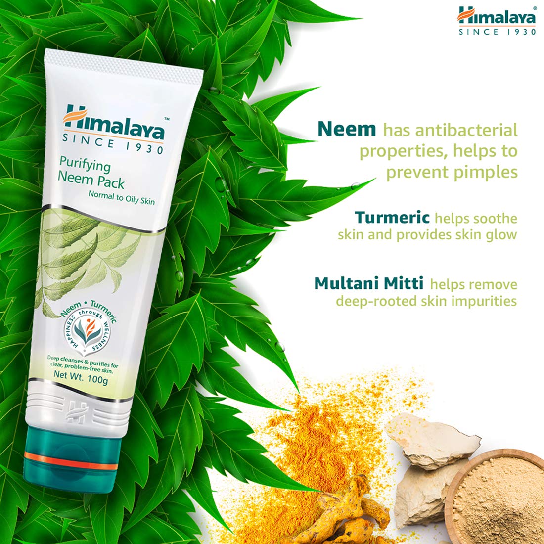 Purifying Neem Pack: Clean, clear and healthy complexion. What it does: Himalaya's Purifying Neem Pack brings together the goodness of Neem, Fuller's Earth and Turmeric, which work together to regulate excess oil secretion, clean clogged pores and prevent the recurrence of pimples. Key ingredients: Neem Oil and Neem leaves are excellent skin care ingredients. The oil relieves dry skin and soothes itchiness, redness and irritation. It also improves general skin health and immunity, combating bacterial infections such as acne, boils and ulcers. Turmeric has been used as an antiseptic for centuries. The herb also has strong anti-inflammatory properties which soothe your skin gently. It also makes your skin soft and supple. Fuller's Earth is primarily used to lighten the skin. It has cooling and anti-inflammatory properties that remove deep-seated dirt and skin pollutants.